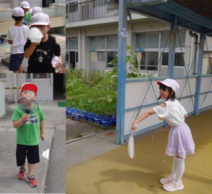 あっちもこっちも、シャボン玉に囲まれる1年生です。お互いの作り出すシャボン玉を見ながら、「もっと大きいものをつくるぞ!」「たくさん一気につくれるよ」思いもアイデアもシャボン玉の数だけ生まれていきました。