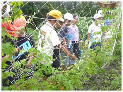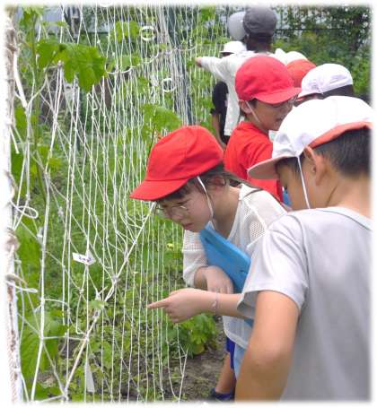自分たちが育てているツルレイシの観察をしています。日々のツルの成長の様子は白テープを貼り、記録しています。今日は、そうした全体像を確かめたり、学習用タブレットで写真を撮って記録したりしていました。