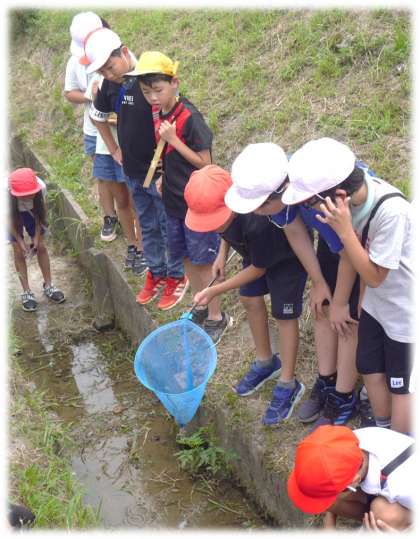 別の学級では、水辺の生き物を確かめるために、田んぼ近くで生き物探しをしていました。