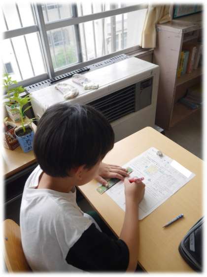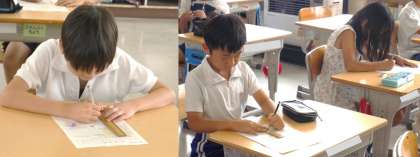 調べた数値を整理するために、表を活用することが分かりやすいと気づき、まずは表に数を整理して記入していきます。そこから読み取った数値をもとに、次はグラフ化です。縦軸の目盛りに気を付けながら、最初にぼうの高さの頂点をおさえ、ものさしを使ってぼうグラフを書いていきます。その際、表す順番もあることを学び合っていました。