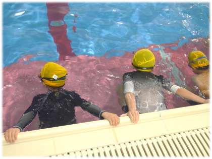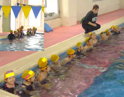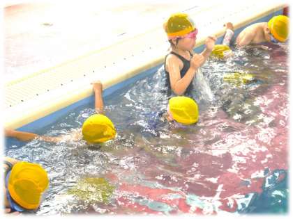 それぞれのグループで、コーチからていねいな指導を受け、水の中にもぐったり、けのびして水中を進んだりすることもずいぶん上達しています。プールサイドで活動の様子を見守っていると、何人もの1年生と目がばっちり合います。そのつど、「泳げるようになったよ」「上手になったでしょ!」という思いが伝わってくるまなざしにアイコンタクトでこたえています。