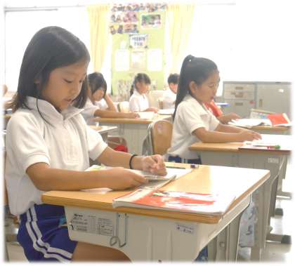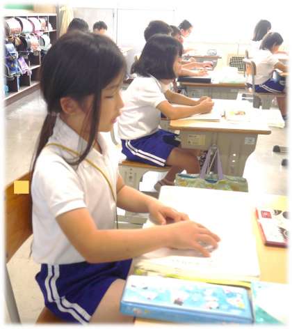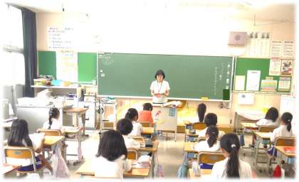 教員の読みに続いて、一文ずつ、しっかりと声に出して読む2年生です。