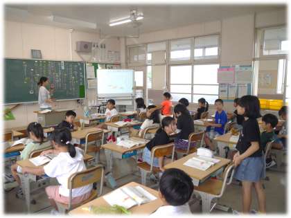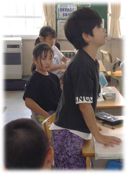 詩「夕日がせなかをおしてくる」の一連を読み、どんなふうに読むとよいか、詩の内容をふまえて考え合う3年生です。