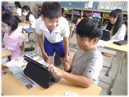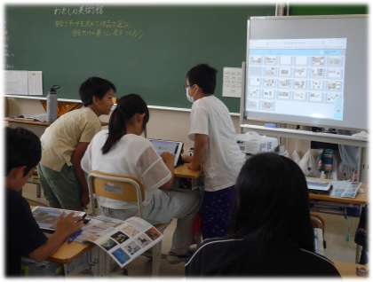 学習用タブレットの発表ノート活用して、次々と作品を選び、レイアウトも考えながら展示準備をする5年生。