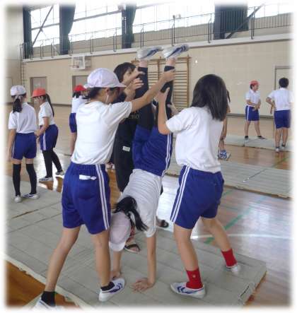 互いにアドバイスをしながら、何度もチャレンジする5年生。慣れてきた人は、支える人を減らして、チャレンジします。体の軸が真っすぐになるように、足先まで意識しながら取り組む姿も見られました。