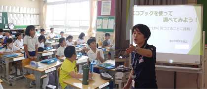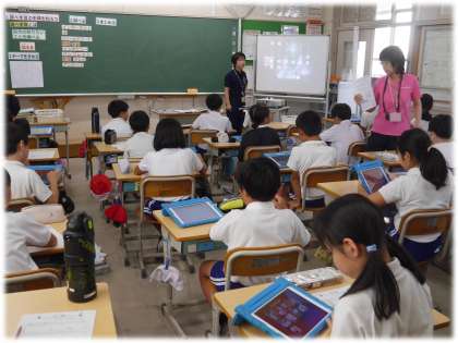 本時では、来週出かける豊田市の環境学習施設であるエコットでの学びに生かすために、タブレット内から閲覧できるパンフレットを活用して、クイズ形式で「早く調べる」ための方法について楽しく学習しました。その際、書籍等を引用するときの注意点も確認し、引用についての理解を深めました。