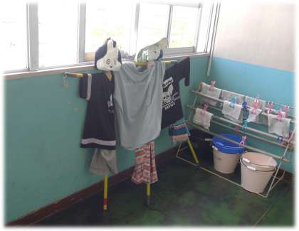 授業中、5年生の教室のある廊下を歩いていると、何かこちらを見ているような感じがして、さっと振り向くと、3体の案山子が肩を並べてこちらを見ていました。