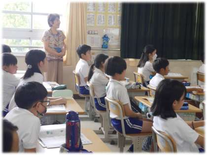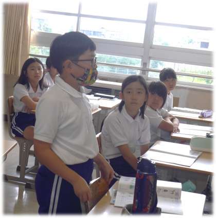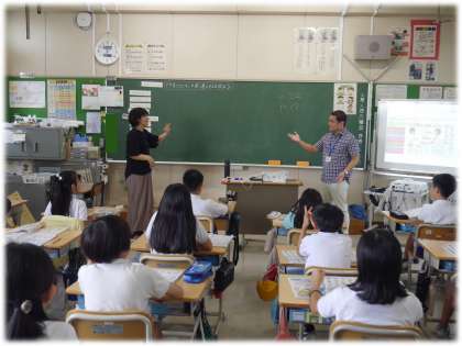 教科担任とALTの英語でのやりとりを見ながら、どんな会話を交わしているのかをつかみます。のりのりの二人のやりとりに、5年生も興味津々です。今日は、できることについて友達と伝え合うために、「Can you〜」のやりとりを学んでいました。