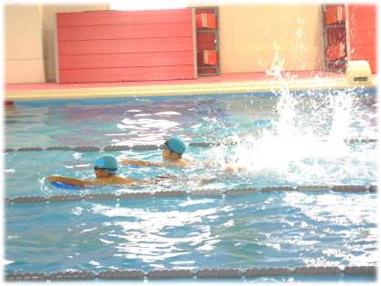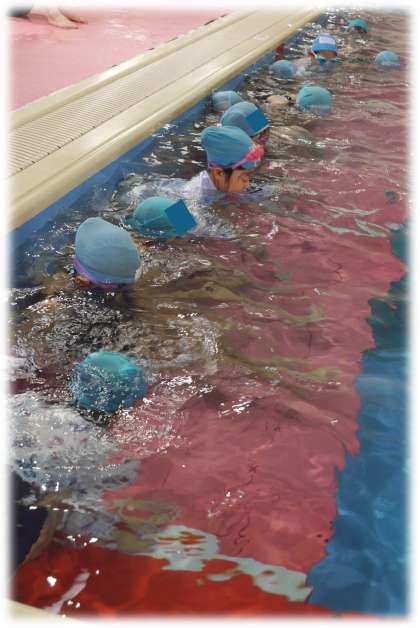 それぞれのグループで、今日も時間いっぱいまでしっかり水に親しみ、泳ぎの力を伸ばす練習に取り組みました。コーチのみなさんが、子どもたち一人一人の様子をみながら、適宜アドバイスをしながら練習が進んでいきます。息を吐く練習、ビート板を使ってバタ足の練習など、それぞれが目標をもって取り組む姿が見られました。