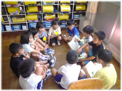ひと通りの練習後、円になって互いの顔を見ながら自分たちの練習を振り返り「もっとこうするといいんじゃないかな」「ここはよかったね」など、互いのよさに気づいたり、さらによくしていくための考えを伝え合ったりする姿に、1年生の成長を感じます。