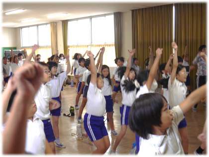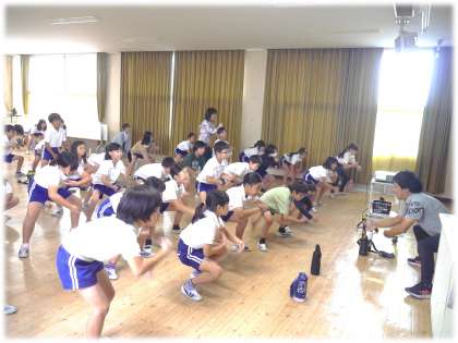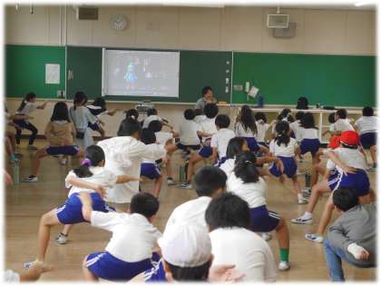 運動会で披露する表現の練習に学年で取り組んでいます。映像を見たり、担任の説明を聞いたりしながら、元気いっぱいに動きをためす4年生です。今は、まだ踊りを覚える段階ですが、すでに元気のよさが気持ちよく発揮されており、今後集団としての迫力ある動きにつながっていく予感がします。楽しみです。