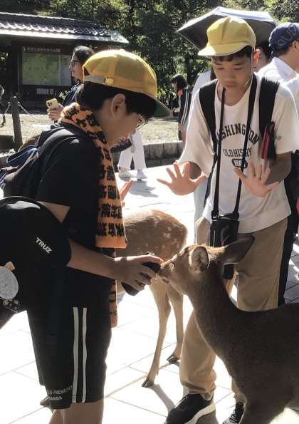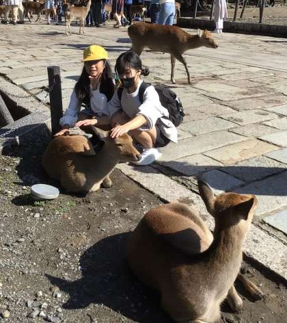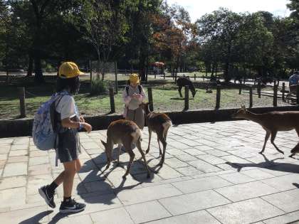 10月9日(水)6年生 修学旅行「最高の思い出2日間スペシャル」38 公開日 2024/10/09 更新日 2024/10/09 学校行事 学級ごとに大仏殿を見学した後は、班奈良公園内の班別行動です。 早速、鹿たちと触れ合う6年生です。 6年生 行事