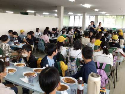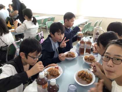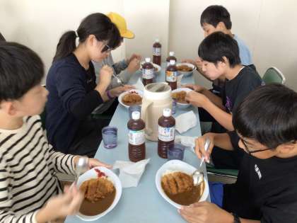 修学旅行でみんなと一緒に食べる食事を締めくくるのは、カツカレーでした。いっぱい歩いて、お腹もぺこぺこです。