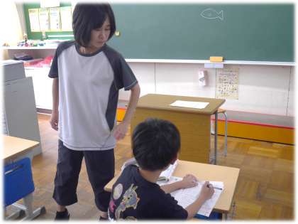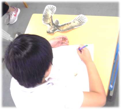5組では、読書感想画の絵を描き始めていました。自分のイメージする鳥などを見本となる写真やイラストを参考に、じっくり画用紙に描きこんでいます。羽根の一枚一枚を丁寧に描きこみ、重なりも考えながら描く集中力には、頭が下がりました。