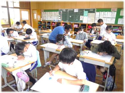 10月25日(金)5年生 図画工作科の授業の様子 公開日 2024/10/25 更新日 2024/10/25 各学年から 読書感想画の制作に取り組んでいます。 「ドラゴンが大きく描けていていいね」画用紙に躍動感いっぱいのドラゴンを描く5年生に向けて、教科担任からも構図のよさについて一言あると、周りの友達はどうなのだろうかと、互いに見合う姿もありました。これからの着色がさらに楽しみですね。 5年生 5678組