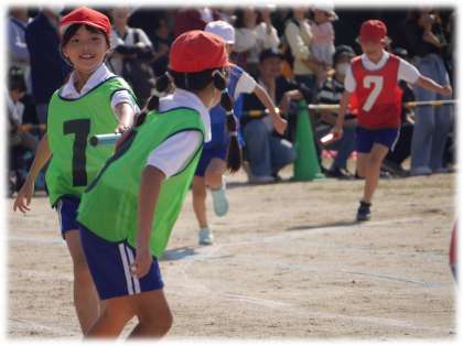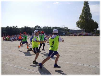 満を持して登場の3・4年生です。まずは、リレー種目「みんなでチャレンジ!つなぐ For you!」です。