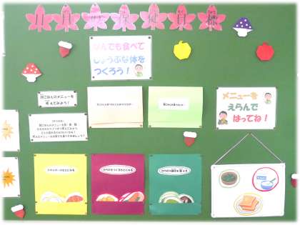 11月の保健目標は「なんでも食べて じょうぶな体をつくろう」です。保健室前の掲示板には、朝ごはんを食べる意味と、実際に自分で朝ごはんのメニューを考えてみるコーナーが掲示されています。前を通るたび、メニューが更新されているので、いろいろな人が献立チャレンジをしているようです。(どのメニューもおいしそうです)