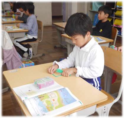 デジタル教科書に載っている6種類の絵と同じかたちにするために、数え棒を使ってつくっていきます。
