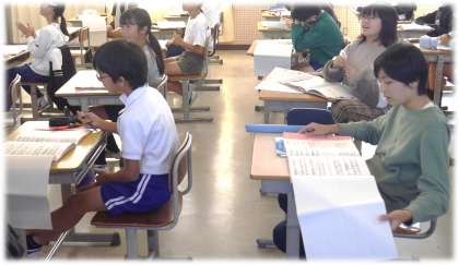 1組の様子です。卒業の歌の練習を行っていました。音階を確認し、教科担任の歌い方のポイントを聞きながら、自分たちの歌い方に取り入れていっています。楽譜を見ると、気を付けることがていねいに書き込まれていました。