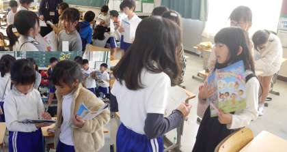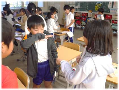 11月11日(月)3年生 外国語活動の様子 公開日 2024/11/11 更新日 2024/11/11 各学年から 2組では、単元「アルファベットとなかよし」の学習を進めています。担任とALTとのやりとりを確認して、実際にペアでどんどん互いのイニシャルを聞き合う活動に入っていきました。ノートには、やりとりした友達のイニシャルがどんどん書き加えられ、増えていっていました。楽しみながら、英語に親しんでいます。 3年生