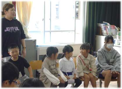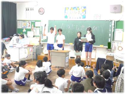 今日は、なかよし遊びの日です。元気タイムになかよしファミリーで集まって、6年生が考えてくれたゲームで楽しい時間を過ごしました。多くの活動場所で、なかよし班が一緒になって交流する遊びを考えて、行っていました。
