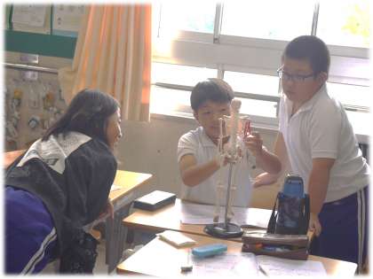 子どもたちの腕が動くときの予想として、筋肉がちぢむ、のびる、ふくらむ、ゆるむ、上下が押し合う、骨と筋肉は一緒に動く、などの考えが班の中で話し合われました。そして、確かめるために、人体模型や手作りの模型などを実際に動かしながら確かめ合っていました。