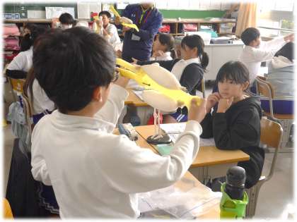 教員の手作りの模型にある筋肉を「ふわふわだ!」と触りながら、実際に動かしてみることで、腕を曲げたときと、伸ばしたときで、「ちぢむ」「ゆるむ」筋肉の動きを確認することができ、驚きの声が上がっていました。