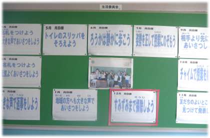 朝の会の終了時、生活委員会の5・6年生が各教室へ出向き、12月の生活目標についてのお知らせを行う姿がありました。12月の生活目標は、「すみずみまで掃除しよう」です。