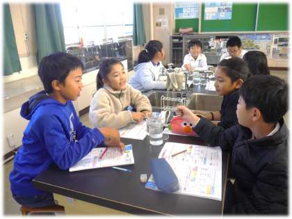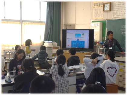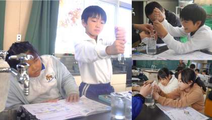 4年1組は、理科室で実験中です。空気の温度が変化すると、空気の体積はどうなるのか確かめている最中でした。実験の結果を整理し、そこから分かることを伝え合います。そして、以前の学習を生かしながら、試験管にはった石けんの膜がふくらんだり、へこんだりする事象から、体積が温度変化によって大きくなったり、小さくなったりすることを結論づけていきました。