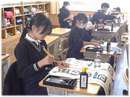 5年1組の書写の様子です。書き初めの練習に前向きに取り組んでいました。教えてもらった文字の特徴やバランスも意識しながら、集中して書いています。