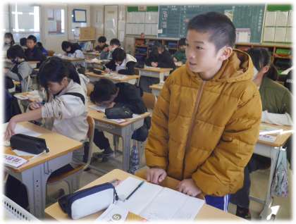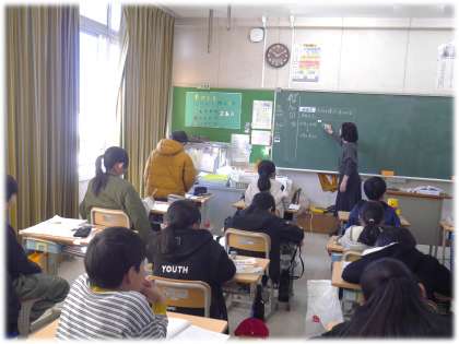 5年3組の様子です。平均の考え方を使って、歩幅を求める方法を考え合っていました。立式の意味を説明する場面では、友達の疑問のつぶやきにも反応して、丁寧に意味を説明する姿が見られました。仲間の疑問をみんなで解決しようとする5年生がすてきです。