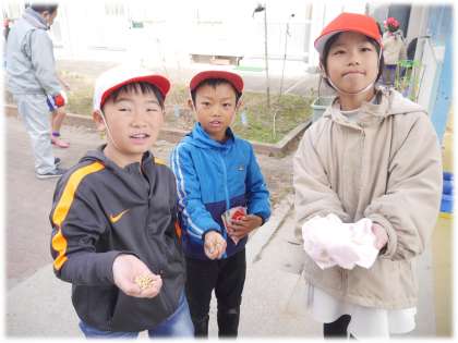 収穫した大豆の何粒かは各自家庭にも持ち帰ります。家族の方にも見てもらいながら、「来年も家で育てて、今年よりももっといっぱい大豆がなるようにしたいです。」と、意気込みを話してくれる3年生もいました。
