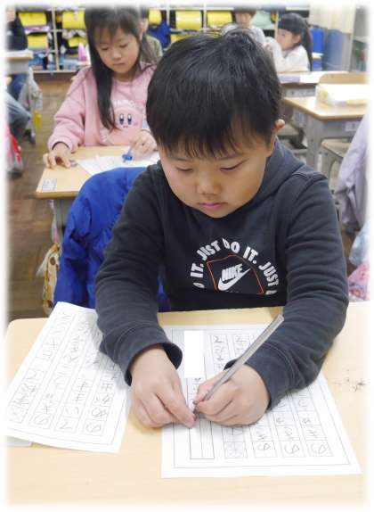 1年2組の様子です。書き初めの練習に取り組んでいました。ひらがな一字一字の大きさやバランス、字形にも気を付けながら、一生懸命に練習しています。