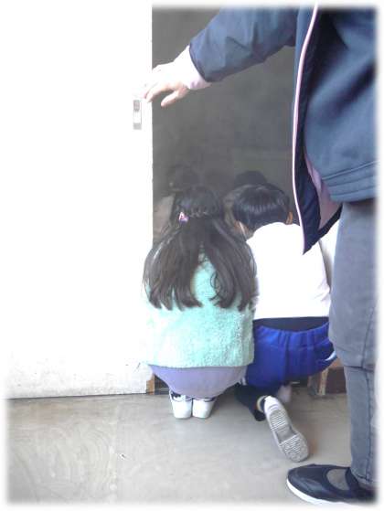 煙が充満して、真っ暗な理科室を教えてもらったことを意識し、どきどきしながら避難体験をした1・2年生です。