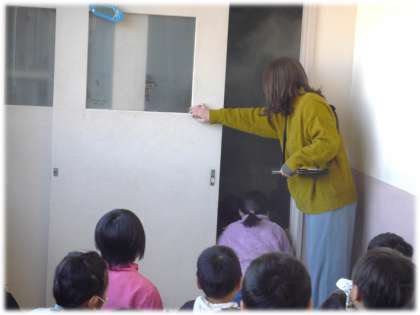 1・2年生は煙道体験です。火事で煙が充満すると、いかに視界が悪くなるのかを体験しました。その際、自分の命を守るために必要なことを講師の方から教えてもらいました。煙を吸い込まないように、ハンカチやマスク、袖口の服などで鼻と口をおおい、あひる歩きのように姿勢を低くして避難すること。そして、もう片方の手で壁を触りながら、通路を確認して進むことを学びました。