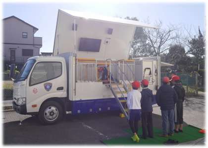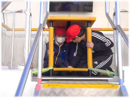 4年生は、「防サイくん」に乗車し、実際の大地震の揺れを体験しました。緊急地震速報が流れ、机の下にもぐると、机の脚につかまっていないと揺さぶられるほどの大きな揺れ