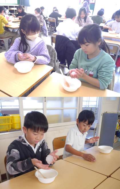 12月23日(月)3年生 学級活動の様子 公開日 2024/12/23 更新日 2024/12/23 各学年から 3年2組ではお楽しみ会「スライムづくり」を行っていました。次第にぷるぷるに固まっていく手触りに大興奮の子どもたちです。 3年生