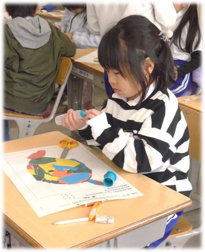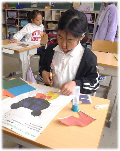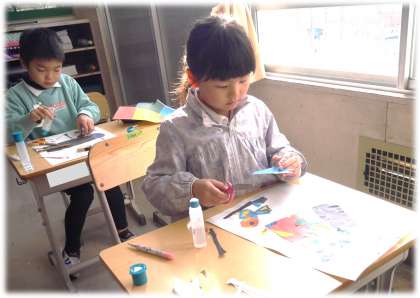 2年1組では、カラフルな紙を使って、自分が思い描く生き物を「つかまえた!」つもりになって、画用紙上に表現しています。走ったり、泳いだり、跳んだりと、まるで本当に生きているかのように生き物の動きをつけながら、制作を進めていました。
