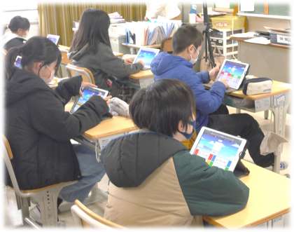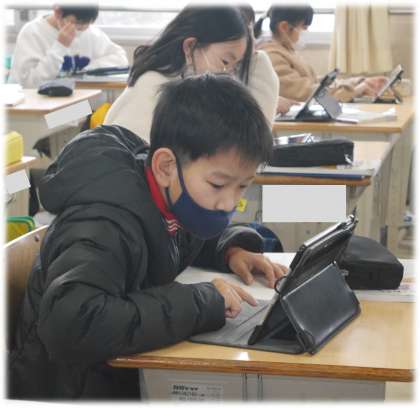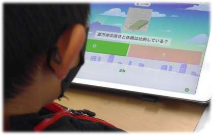 5年3組では、学習した図形の復習を学習用タブレットを活用して、楽しみながら行っていました。クイズ形式でタイムトライアル。みんな集中して取り組んでいます。