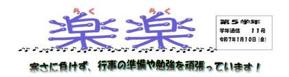 先週金曜日(1月10日)に、5年学年通信「楽楽」第11号を発行し、お子様を通じて配付しています。ご確認をお願いします。掲載が遅くなり、申し訳ありませんでした。