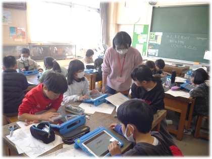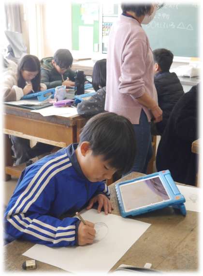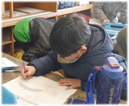 4年1組では、版画の学習を進めています。まずは、躍動感ある海の生き物を下絵で表現していきます。その際、版で刷ったときの黒と白のバランスも考えながら下絵を完成させていきました。海から元気よくジャンプするイルカ、紙面いっぱいを悠々と泳ぐクラゲなど、思い思いの海の生き物を表現する4年生です。これからの制作が楽しみですね。