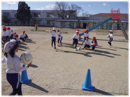1月17日(金)1年生 体育科の授業の様子 公開日 2025/01/17 更新日 2025/01/17 各学年から 1年1組は、運動場でサッカーボールを蹴ってカラーコーンに当てる活動に取り組んでいました。ボールのどこを蹴ると真っ直ぐにとぶのか、また力加減はどうかなどを考えながら、赤白のチームで元気いっぱいに活動をしていました。 1年生 5678組