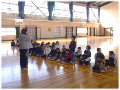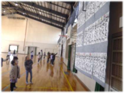 2年1組は、体育館で展示されている書き初め作品をじっくり鑑賞しています。