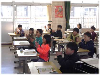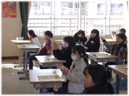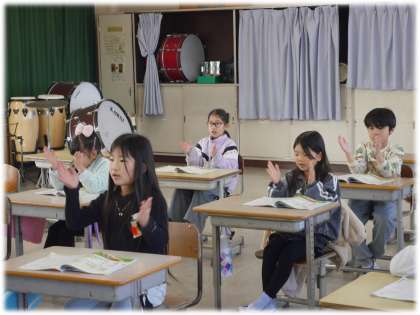 2年2組は、音楽に合わせて歌いながら、楽しく手拍子で拍をとっています。全休符を教科担任が示すと、「帽子が反対になっているみたい!」と、楽し気なつぶやきが聞こえてきました。4分の4拍子の楽曲のため、4拍分休みになることを確認し、拍に気を付けて、繰り返し練習していました。歌声と手拍子のリズムがぴったりと合って、その重なりが心地よく感じます。