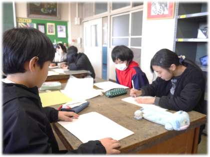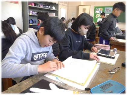 1月17日(金)5年生 図画工作科の授業の様子 公開日 2025/01/17 更新日 2025/01/17 各学年から 5年1組では、下絵を版にうつす活動を進めています。用紙がずれないように気をつけながら、真剣な表情で下絵をなぞっていました。そして、いよいよ彫りが始まります。安全に気を付けて制作を進めていきましょう。 5年生