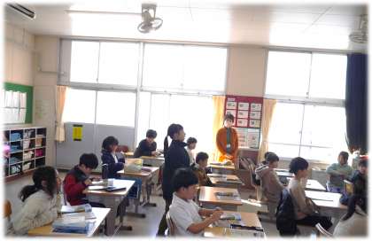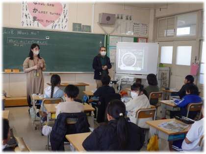 3年1組では、担任、ALTと英語ボランティアの方と一緒に授業を行っていました。今日は、「What’s this?」の表現活動に馴れ親しんでいきます。まずは、担任とALTが見本を示します。ALTが教室にある物(タイマー、教科書、チョークなど)を次々と指しながら、「What’s this?」と問いかけると、担任はもちろんのこと、子どもたちも一緒になって答えていました。「Good job!」とほめられ、にこにこの3年生です。