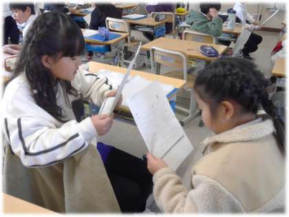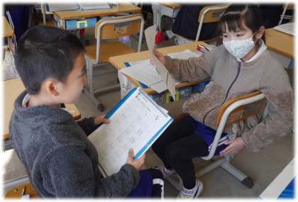 3年3組では、単元の学習に入る前に、読み上げ計算をペアで行っています。今取り組んでいるのは分数です。同じ時間であっても、繰り返し行うことで前よりもすらすらと言えるようになっています。記録が伸びることにやりがいを感じて取り組んでいる3年生です。