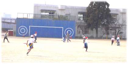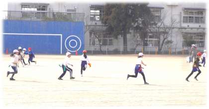 3年1組は、元気いっぱいにタグラグビーに取り組んでいます。まずは、体慣らしと攻守の動きを確認しながら、運動場全体を使って、追いかけっこをしていました。腰につけたタグを取られて悔しそうにする姿。相手の動きを予測して、フェイントでかわす姿。全速力で追いかけ、見事タグをゲットする姿。思いっきり体を動かして、運動に取り組む3年生です。