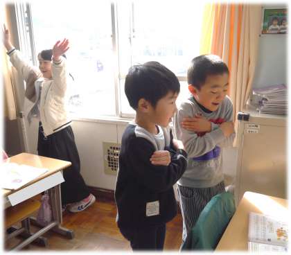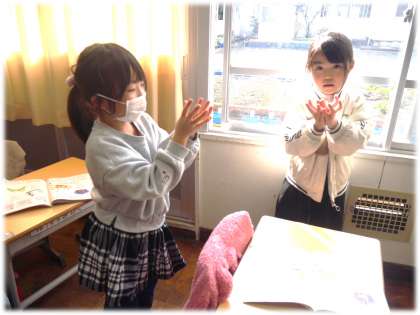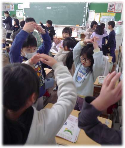 1年1組では、グループに分かれて、相談しながら歌詞を表す振りを考え合っています。歌詞の意味を考え、その様子が伝わるように、「こうがいいんじゃない?」「これはどうかな」と、体を使って表現している1年生は、どのグループもとても楽し気です。