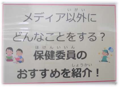 今週の月曜日の児童集会で、保健委員会から紹介のあったノーメディアデーの取組について、保健室前の掲示板にも家庭でどのようなに過ごすことができるのか、取組例が紹介されています。保健委員の5・6年生のおすすめの過ごし方や全校児童の毎月の取組で特に多く実践されている過ごし方が示されています。今月のノーメディアデーは、1月30日(木)です。ぜひ、自分の過ごし方の参考にできるとよいですね。